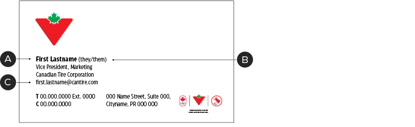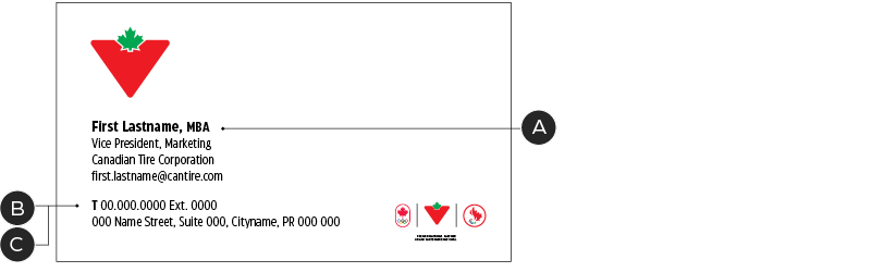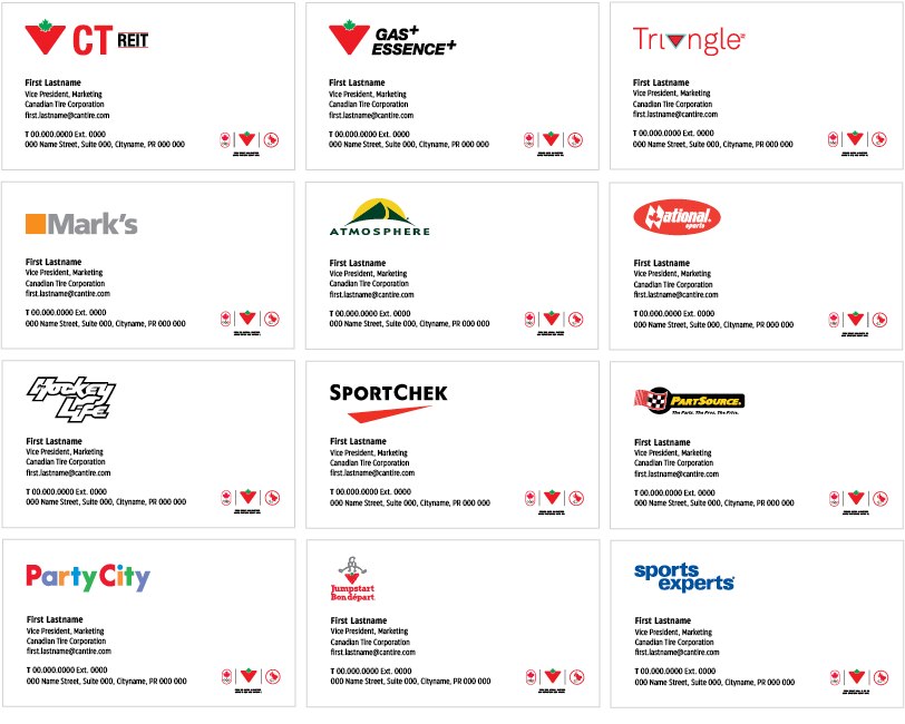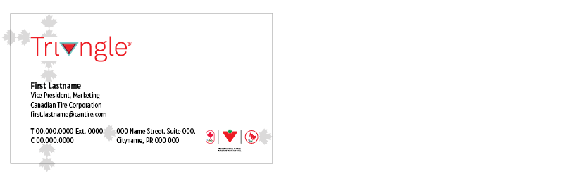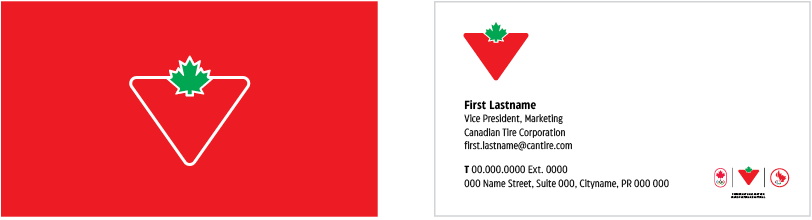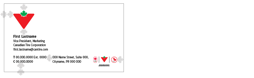 All CTC banner business cards use the leaf from the Canadian Tire Brandmark as a guide for placement and size. For any new cards, please follow the same approach.