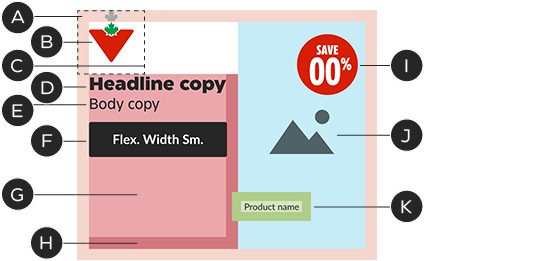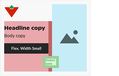 The sizing and layout of fixed dimension components has been optimized for every common IAB/network banner size. This means margins, padding, Brandmarks, buttons and badges are different for each common size—and they cannot be adjusted. Variable dimension components—e.g., headlines, images—may be adjusted to suit the layout.