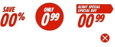 A – Savings indicator – Can be Save ($ or %), Save up to, Now, From, Only, Your Choice, X for, Buy One, Get One/Get the 2nd, fraction off, Great Value, Special Buy or New Lower Price.