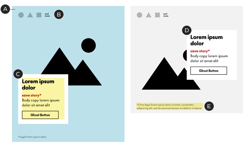 B – Logos (optional) must be in Black or White, no more than 30px tall or 40px wide, and be spaced out by 20px each. Logos sit 36px from the top and 36px from the left edge. If required, use the "and more" copy provided in the templates