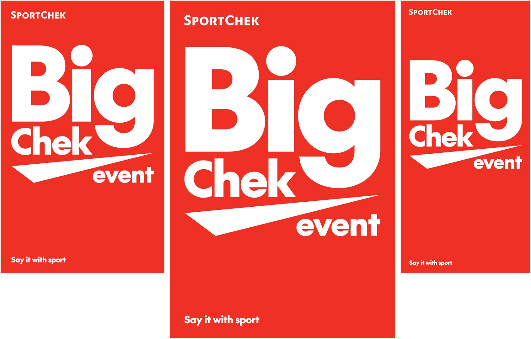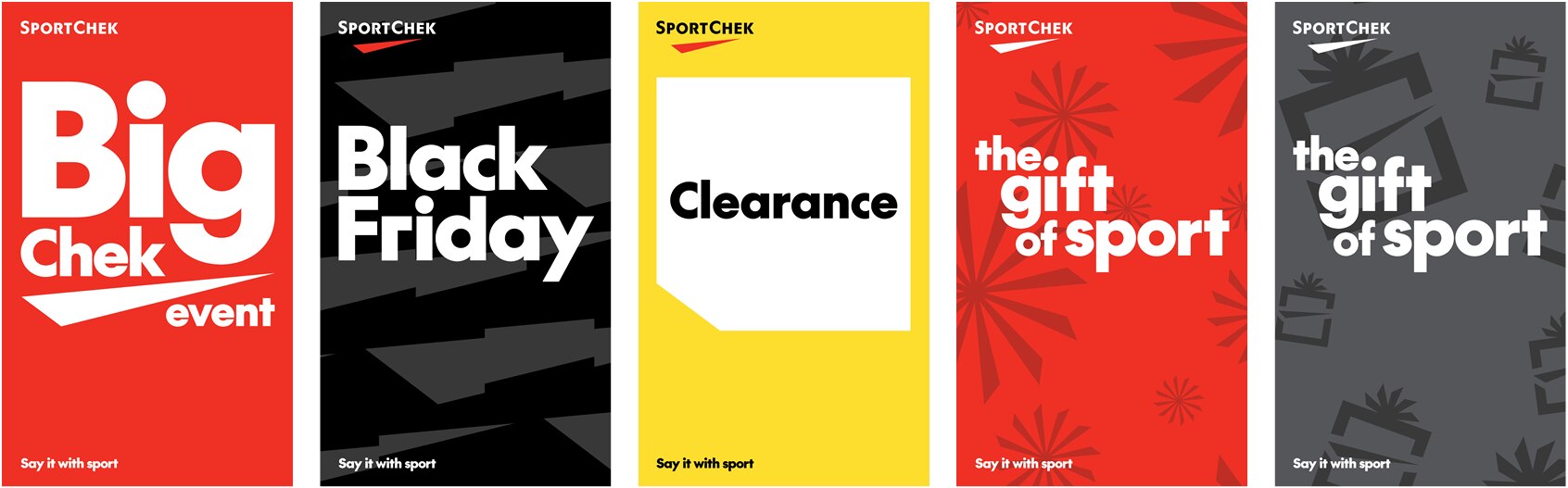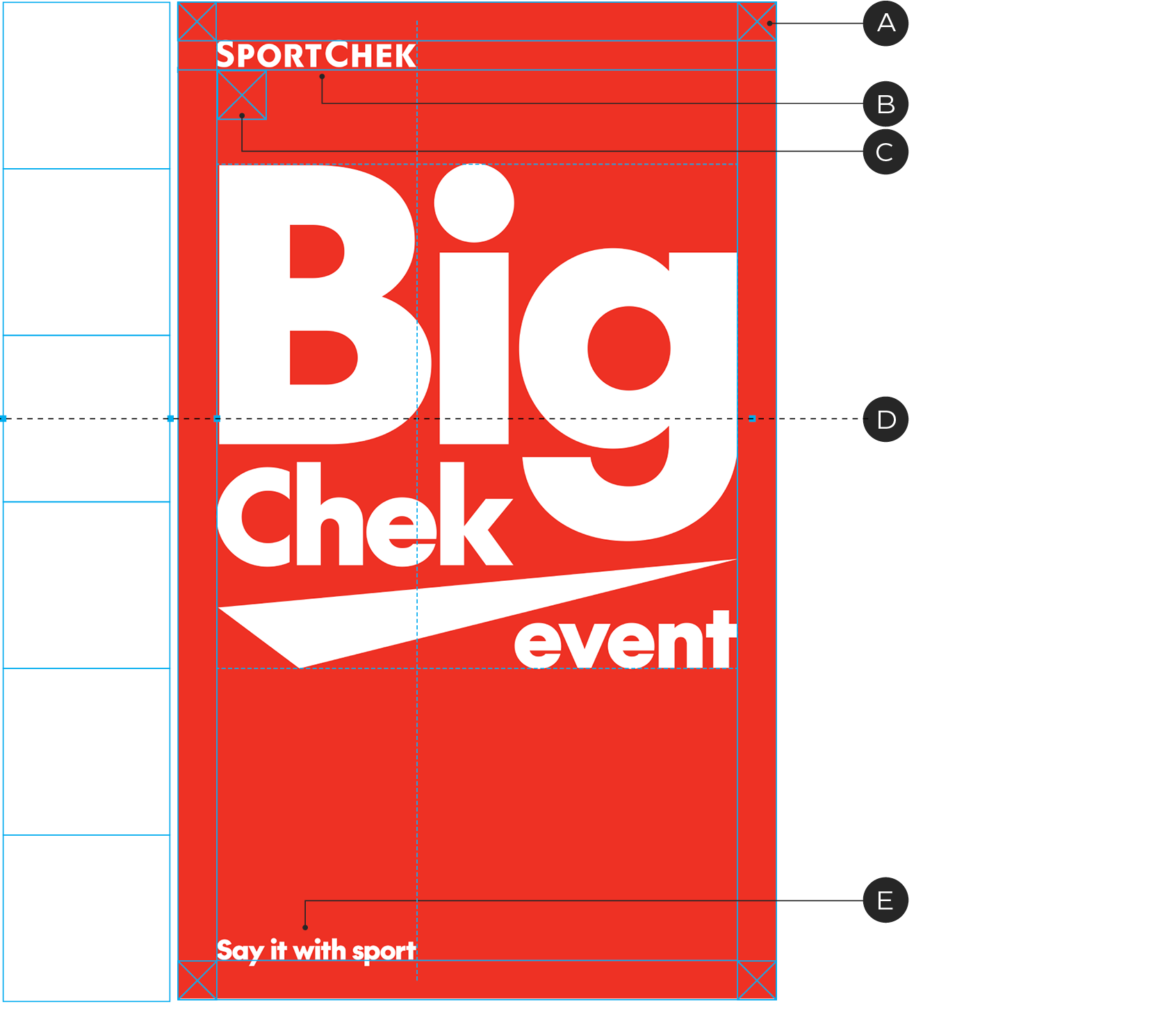 E – Tagline is aligned to the lower left corner of the layout and matches the width of the Sport Chek logo