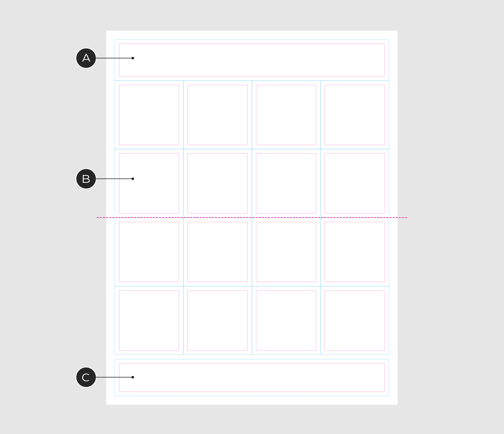 The inset grid is the boundary for graphics and copy within a module. When placed in a single module, the margin created is specifically designed to be the correct padding for the Chek Box Frame or Implied Chek Box Frame. For larger frames, adjustments are necessary. Chek Box Frames are built into our supplied templates.