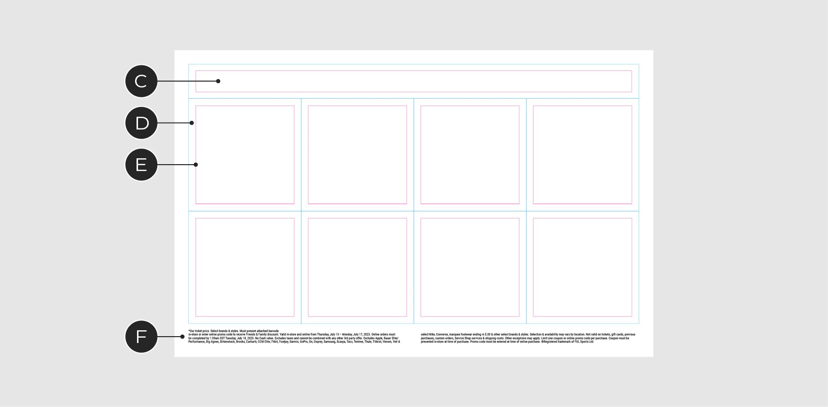 The grid for the postcard follows the same square module system as the flyer. However, with the smaller page size, it becomes a 2x4 grid. A header is placed above the grid on the back side with room for legal copy below. The front page is reserved for a single creative piece and has no restrictions from rows or columns.