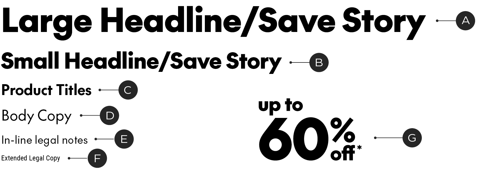 Type sizes and spacing should stay consistent throughout the postcard. In order to create hierarchy between offers we recommend using larger headline sizes with limited use.
