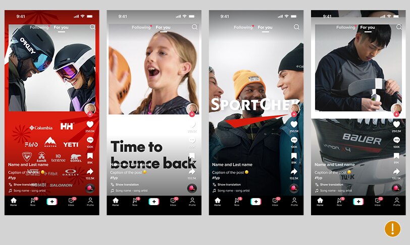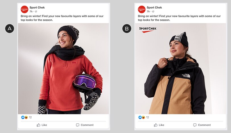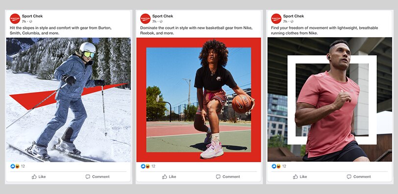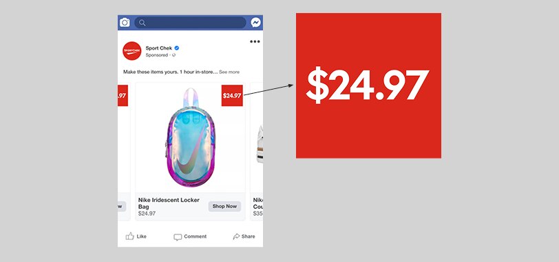The price callouts in this Facebook dynamic ad should use our brand colours and font if possible, as well as a recognizable Sport Chek shape: a square box.