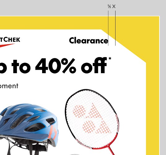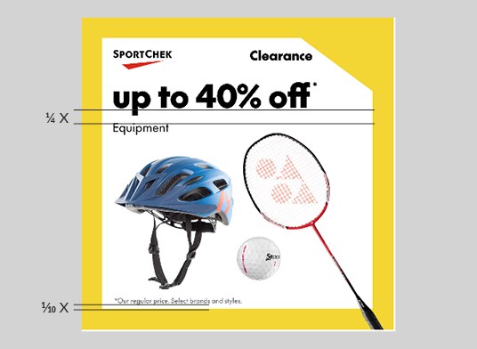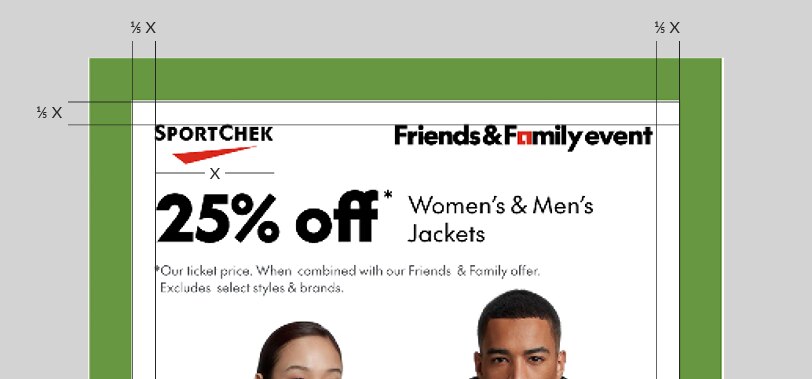 In Clearance layouts, lockups and text should maintain the 1/5-Brandmark-width distance from the point of contact with the cutout