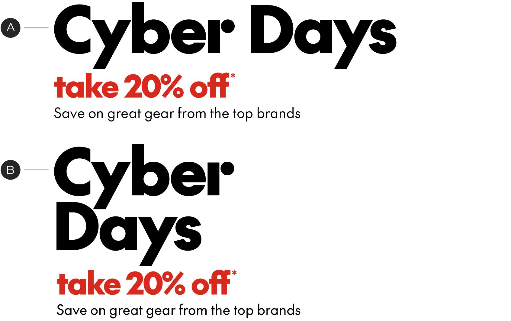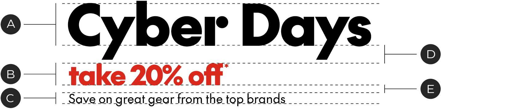 When creating lockups for Cyber Days, we recommend the event name is significantly larger than the save story. These events are building brand equity and we want the event title to be the top level in the hierarchy. For other options in lockup hierarchy see the Lockup Scaling page.
